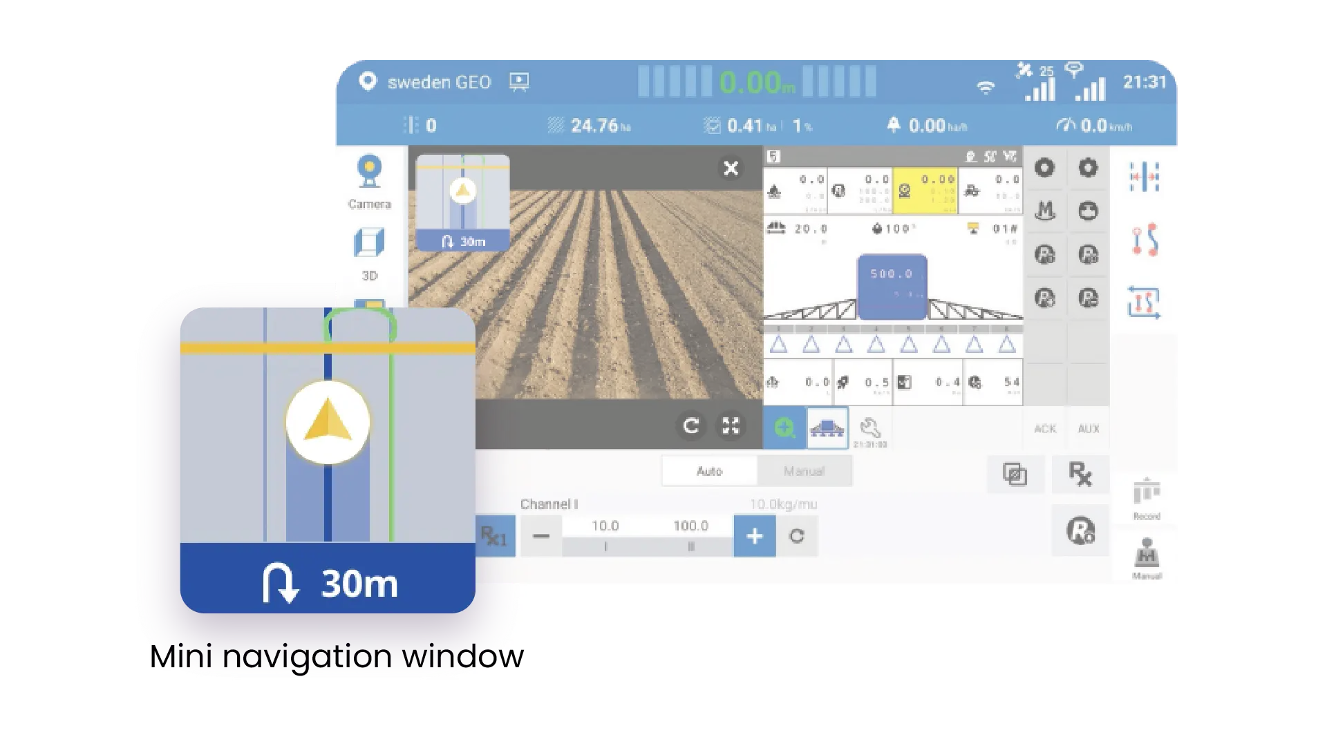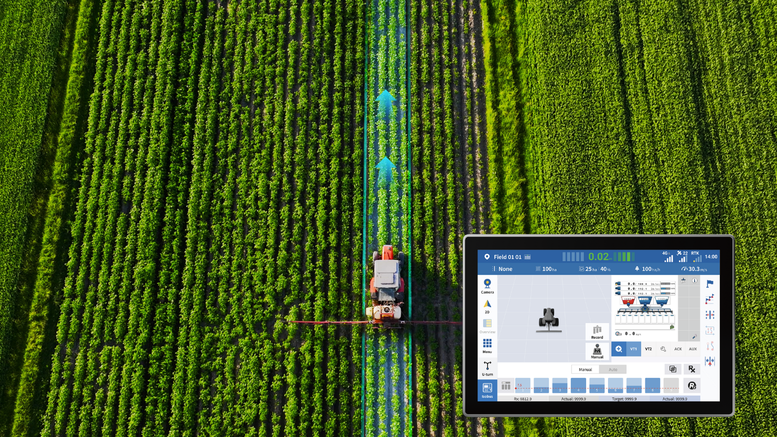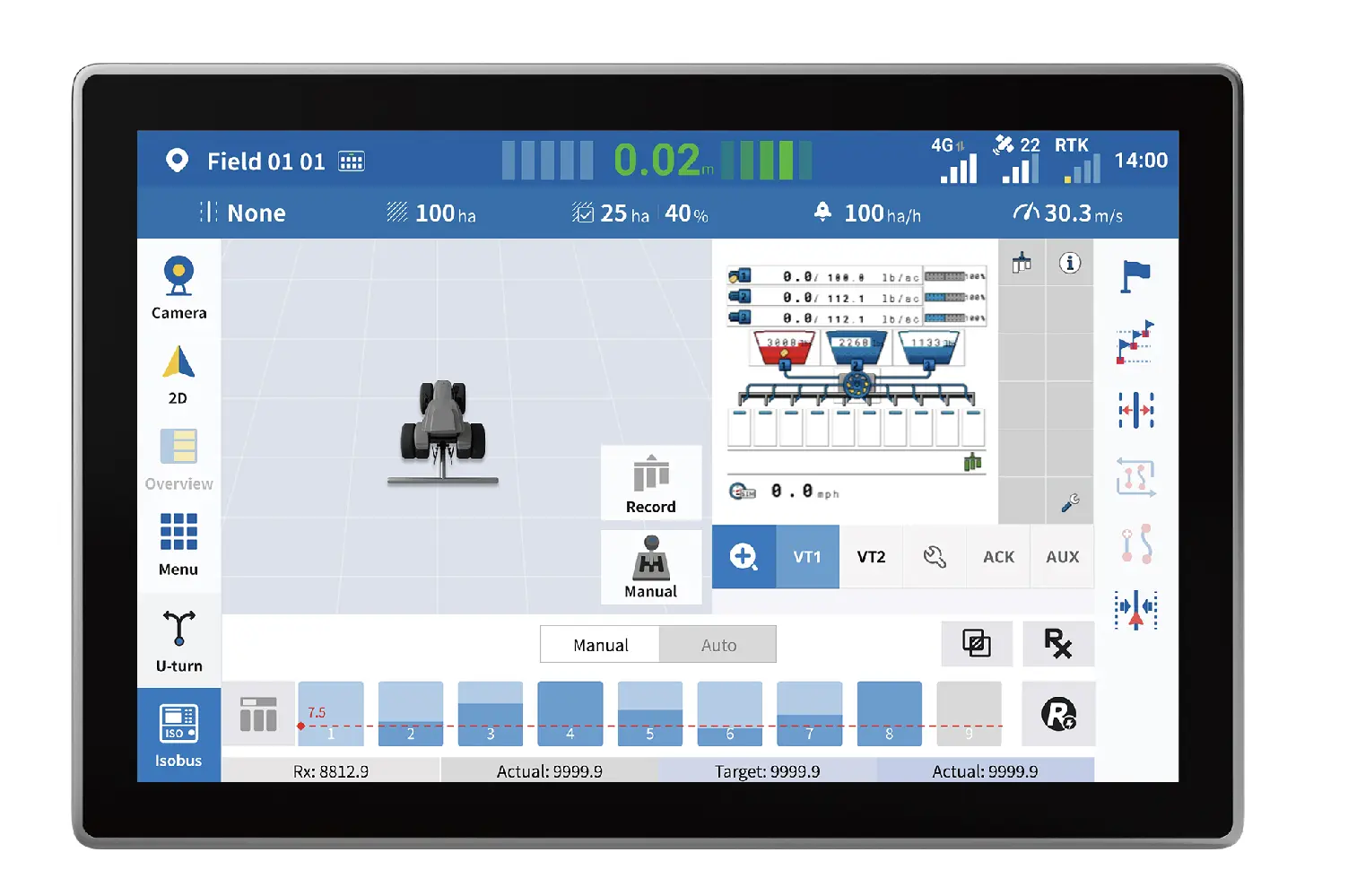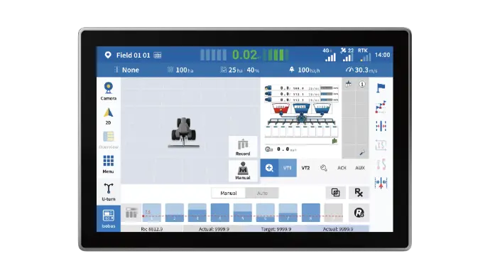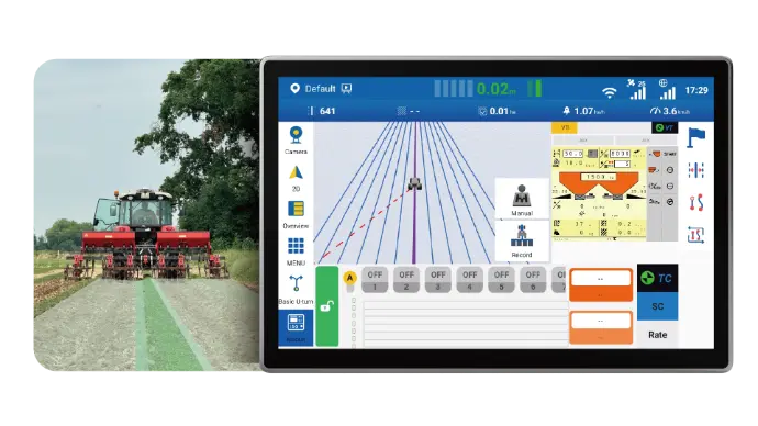 Un'esperienza ISOBUS UT più raffinata. Supporto per la visualizzazione UT a schermo intero insieme a una mini finestra di navigazione, che consente di visualizzare lo stato e il posizionamento sul campo in qualsiasi momento. Che si stiano configurando i parametri o monitorando l'avanzamento delle attività, tutto rimane chiaro, reattivo e a portata di mano.