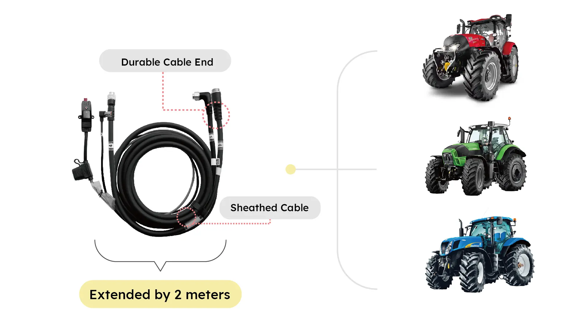 F200 Max presenta un design dei cavi migliorato per un'installazione più fluida e un'esperienza quotidiana più affidabile. Il cablaggio principale è stato esteso di 2 metri per adattarsi meglio ai trattori più grandi e semplificare il passaggio dei cavi. Tutti i punti di collegamento principali sono ora dotati di protezione per connettori stampata, riducendo l'usura e riducendo al minimo i cavi esposti.
