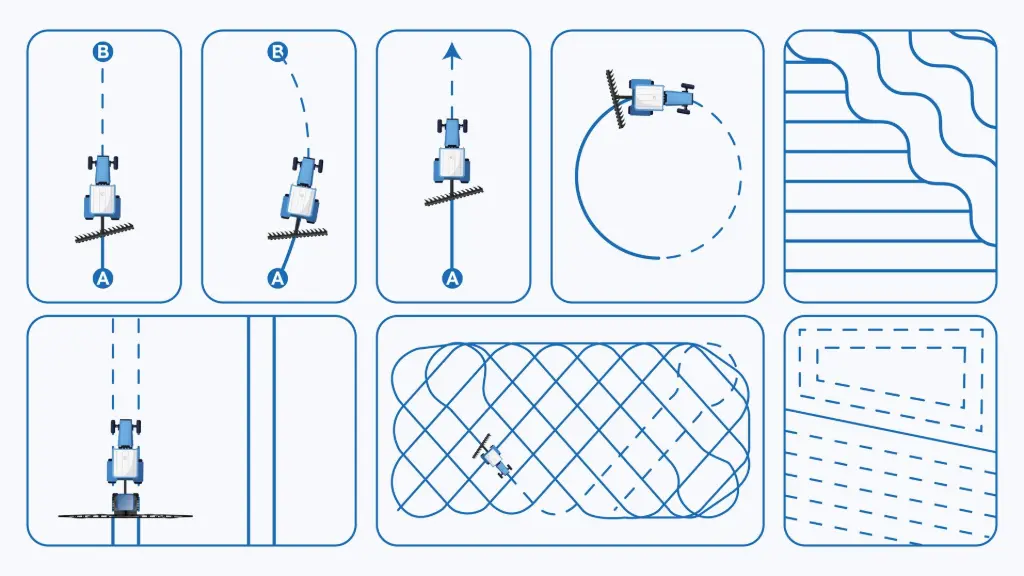 Scegli tra diversi tipi di linee guida per adattarle al layout del tuo campo e alle tue esigenze operative: Linea retta AB, Linea A+, Pivot, Curva, Gruppi di linee e Linee combinate. Queste opzioni flessibili ti aiutano a pianificare in anticipo percorsi che ottimizzano la copertura e riducono al minimo le sovrapposizioni.